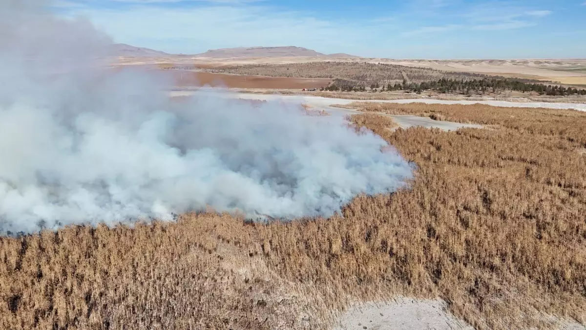 KONYA’nın Kulu ilçesinde birçok kuşun üreme alanı olan ve bu yıl tamamen kuruyan Gök Gölü’ndeki sazlık alanda dün çıkan yangın itfaiye ekiplerinin müdahalesine rağmen devam ediyor.
